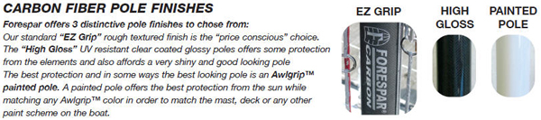 CUSTOM POLES Clear coated carbon fiber products require periodic recoating to protect against UV damage. Depending on geographical area levels of U.V. exposure, recoating may be needed annually. Recoating can be applied using Awlgrip High Gloss Clear #G3005 and #G3010 converter. Forespar strongly recommends white Awlgrip coating if poles are to be stored on deck or up the mast.
